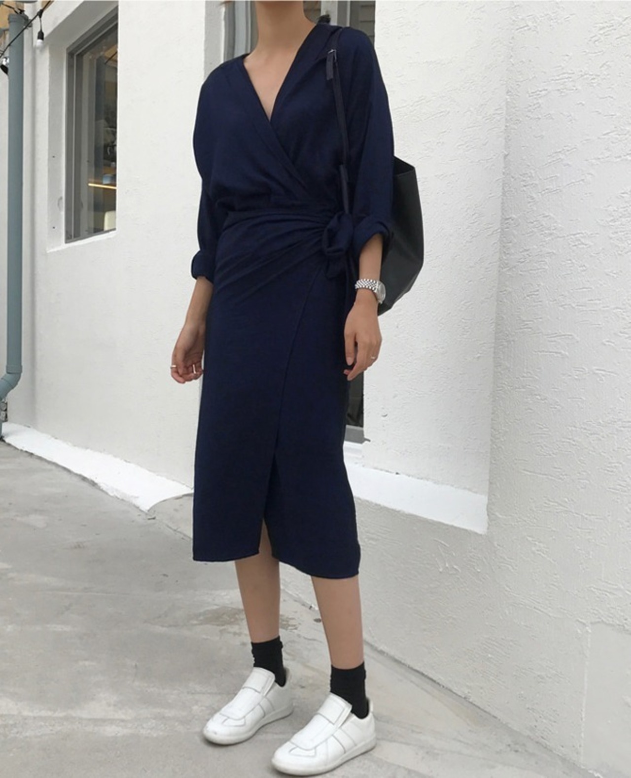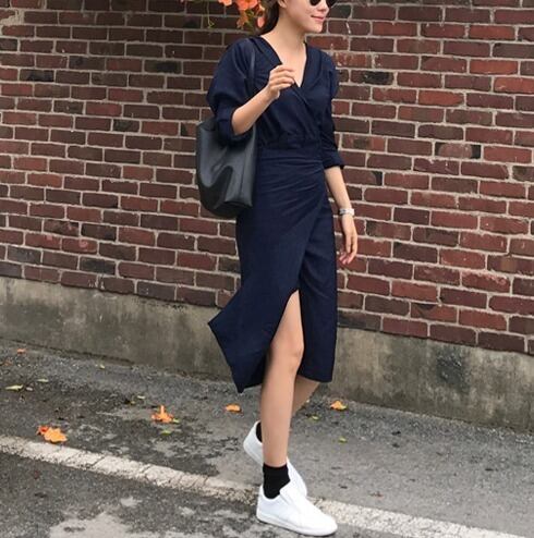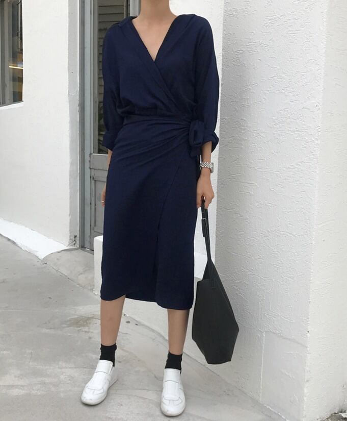 トレンドネックラインターンデザインシャツワンピース ネイビー