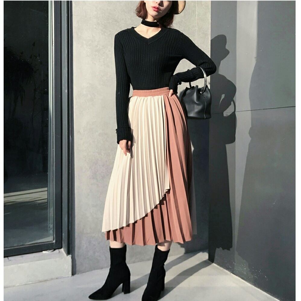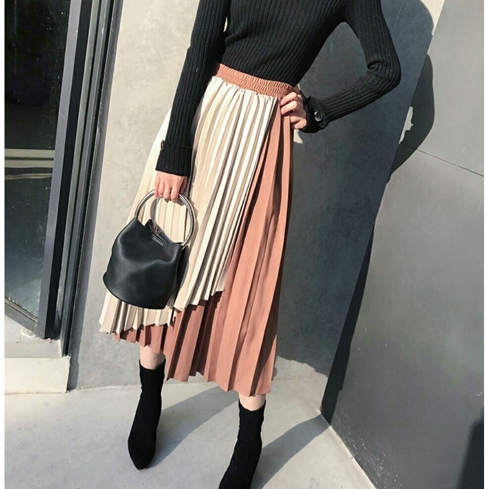 アシンメトリーなバイカラープリーツロングフレアスカート