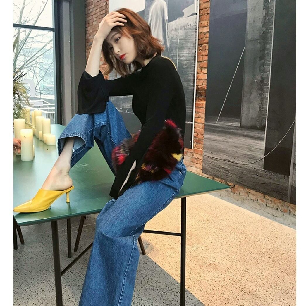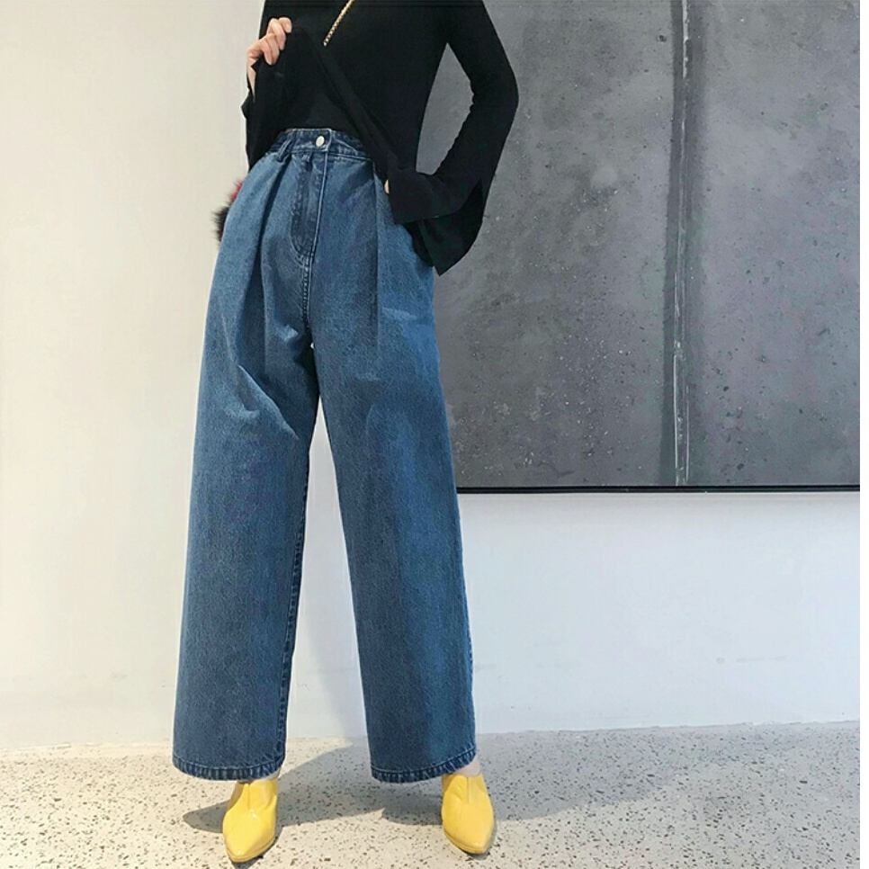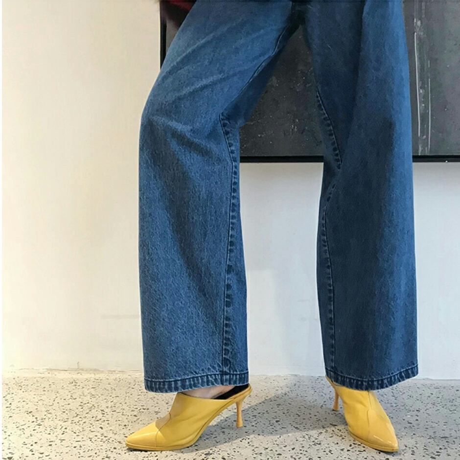 幅広トップスにおしゃれなシンプルデニムワイドジーンズ