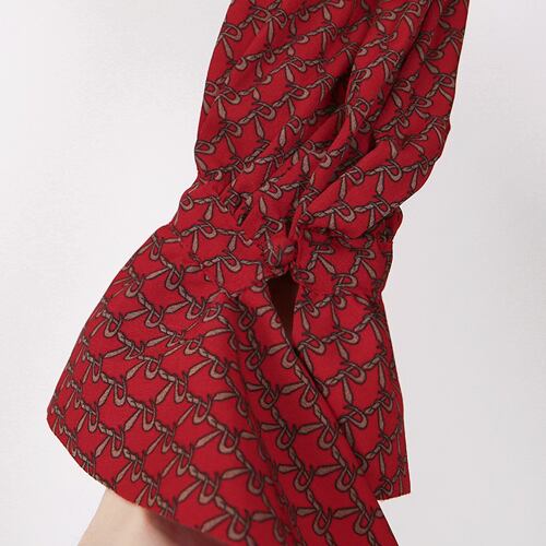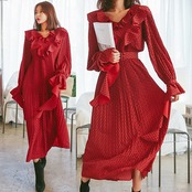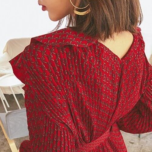 ユニークパターンフリルロングワンピース+ベルトSET レッド