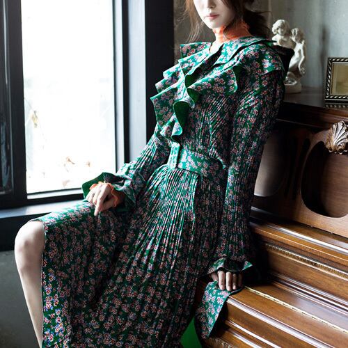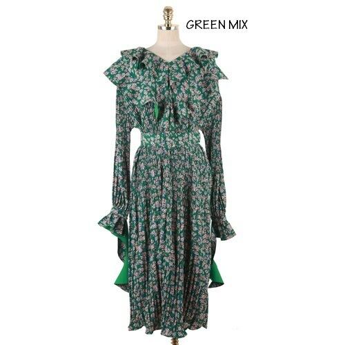 フェミニン★Vネックフリル花柄ワンピース+ベルトSET グリーンMIX