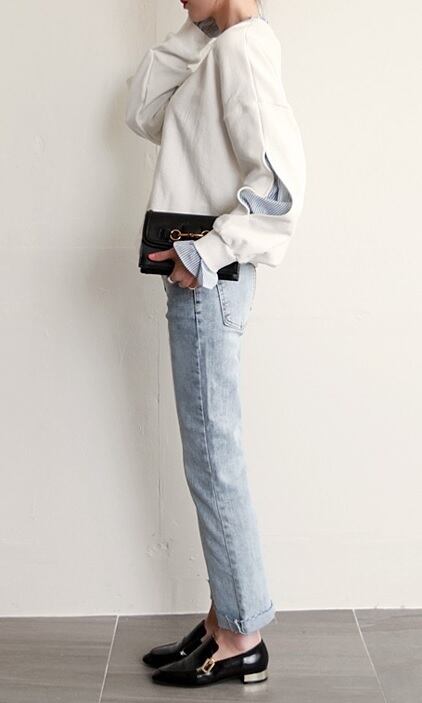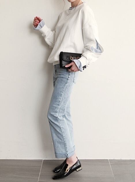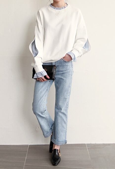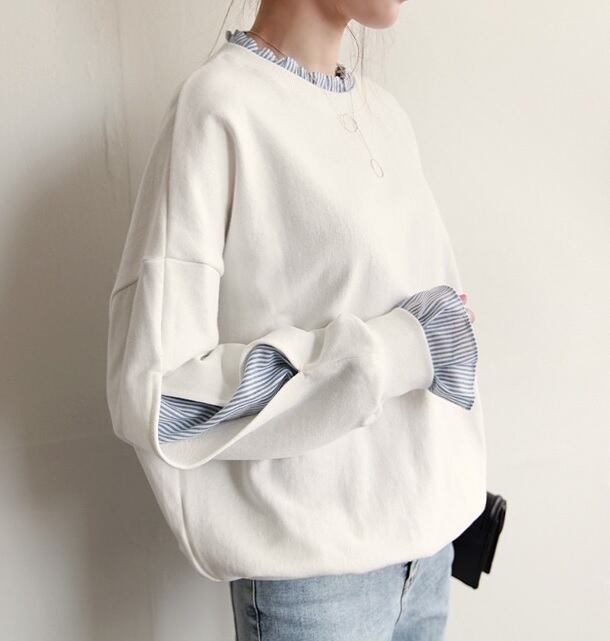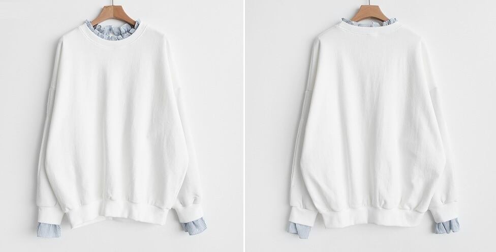 ストライプシャツ フリル レイヤード スウェット トップス ホワイト