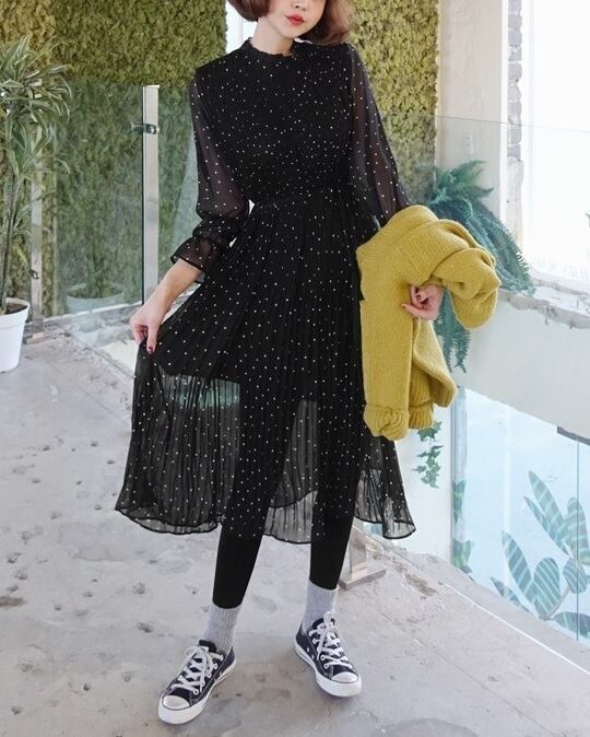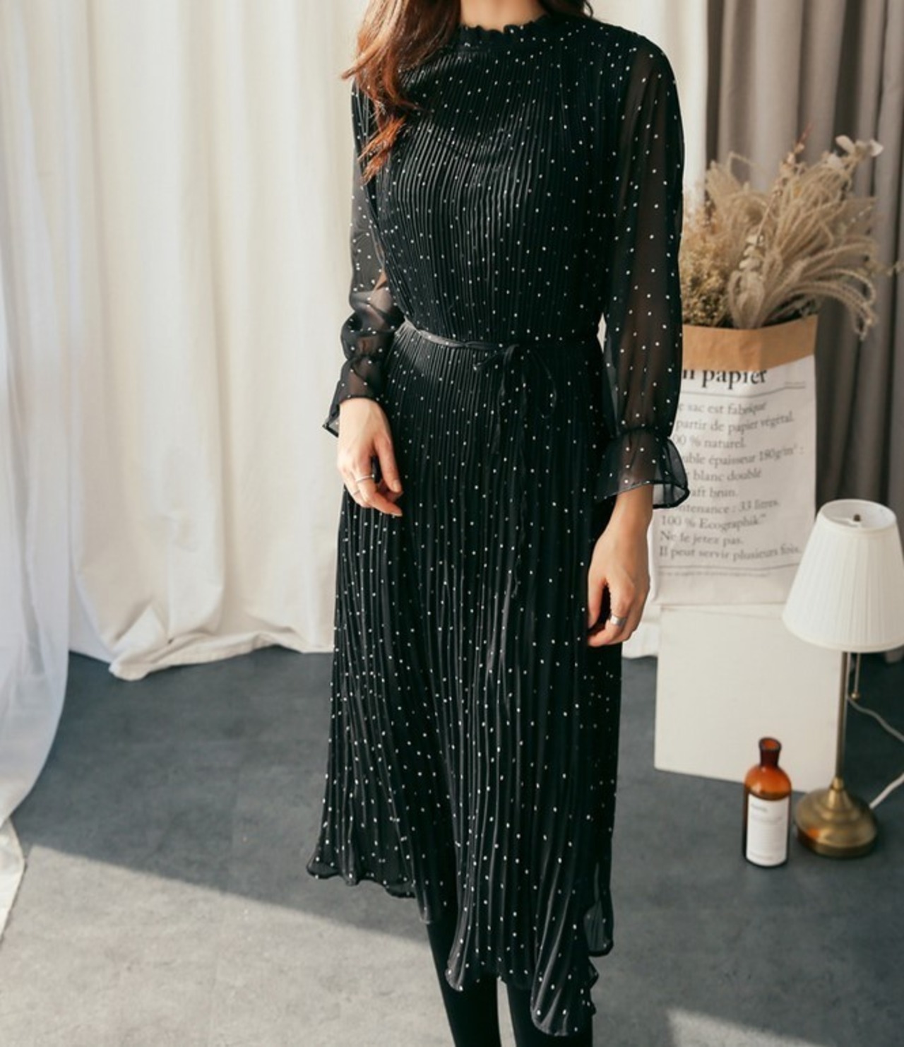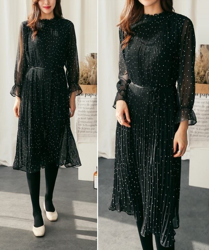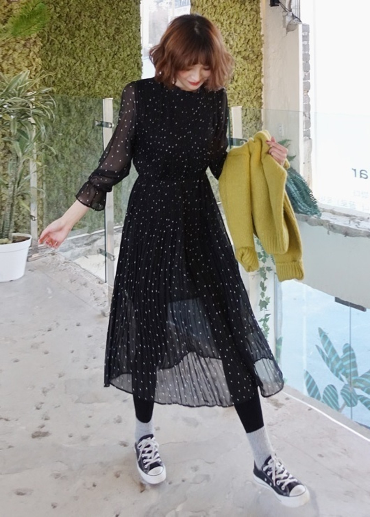 水玉 ドット柄 シフォン プリーツ ワンピース★ 袖シースルー♪ ブラック