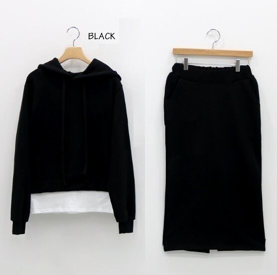 ゆったりカジュアル★シャツ付きパーカー+スカートSET ブラック