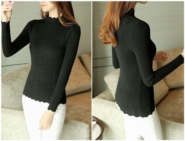 ニット 長袖 美ライン ユニーク葉形 ネック,袖,裾 ブラック