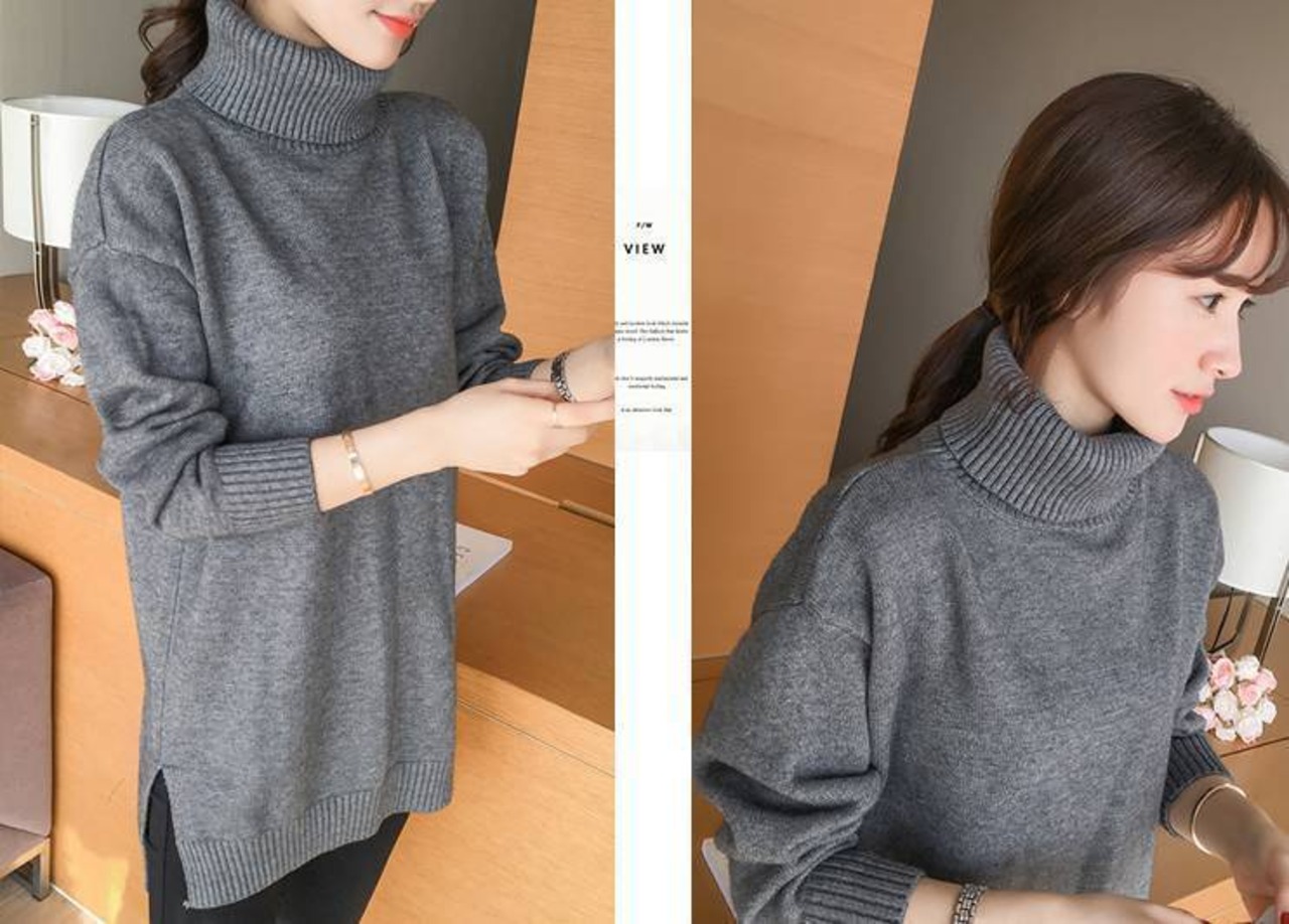 ゆるニットセーター 長袖 ハイネック 裾長め グレー
