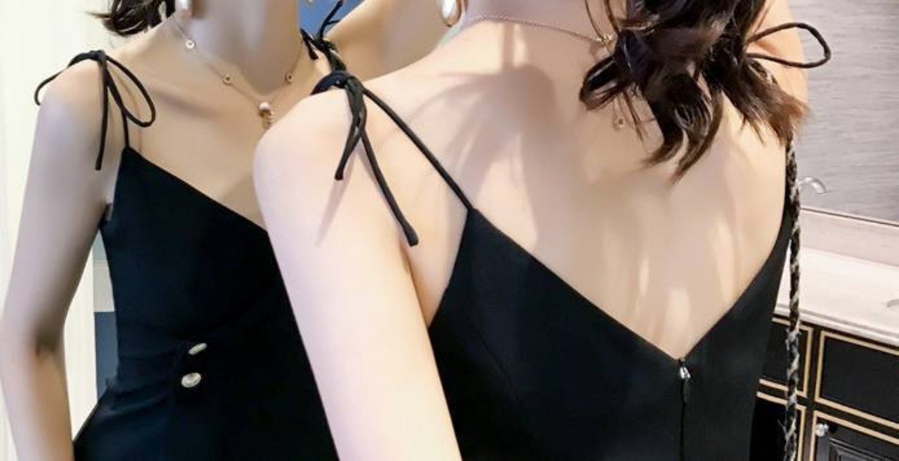 ドレス ショート丈 スリット ボタンアクセント ブラック