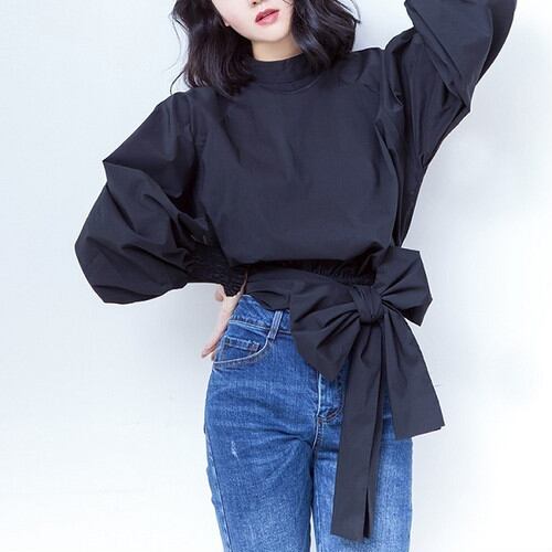スタンドカラー ブラウス リボンベルト プルオーバー ブラック