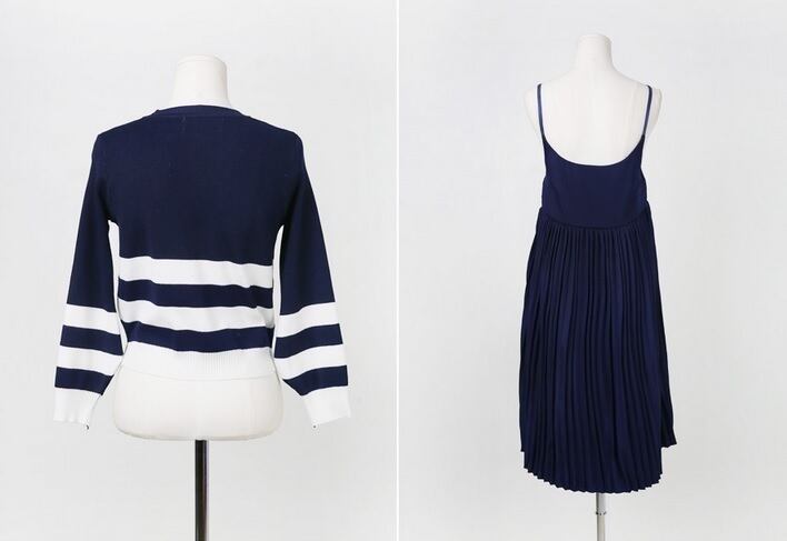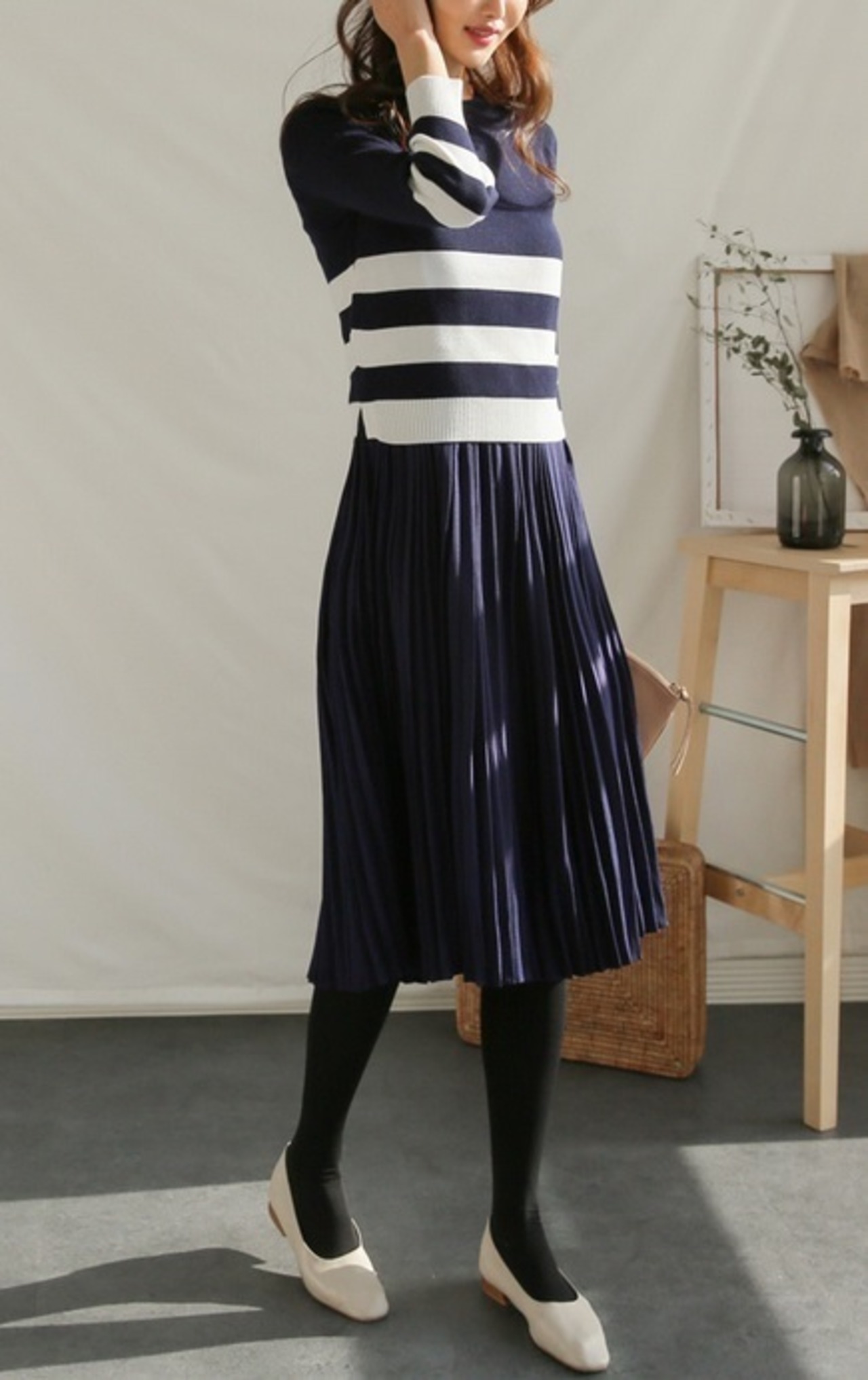 ボーダー ニット& プリーツ ワンピース SET ネイビー