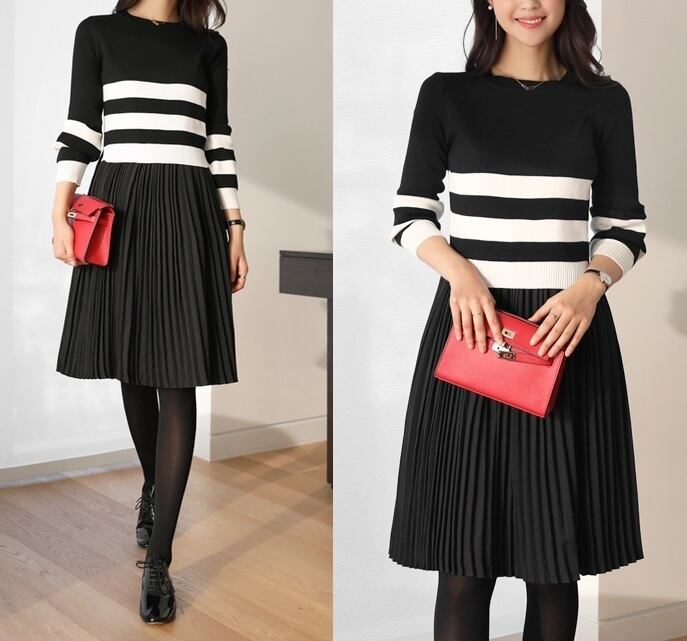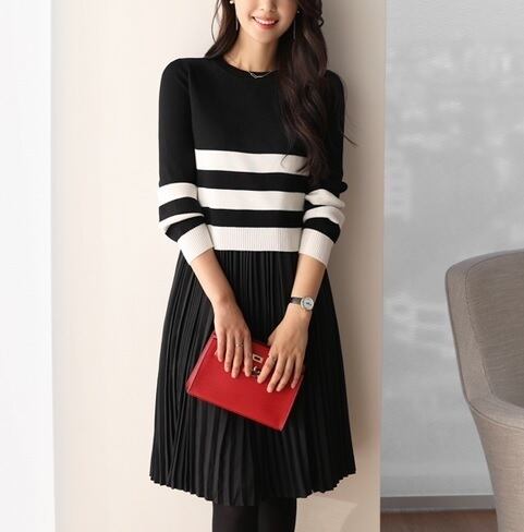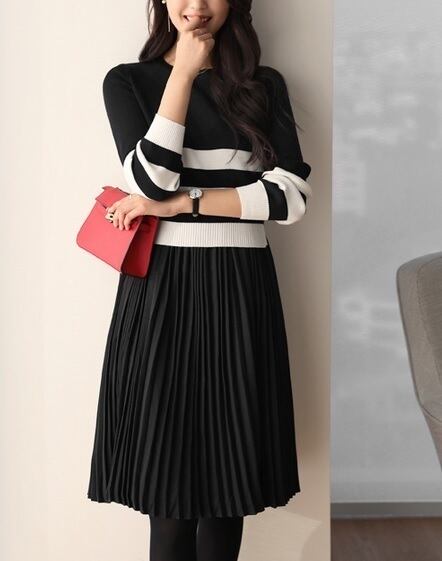 ボーダー ニット& プリーツ ワンピース SET ブラック