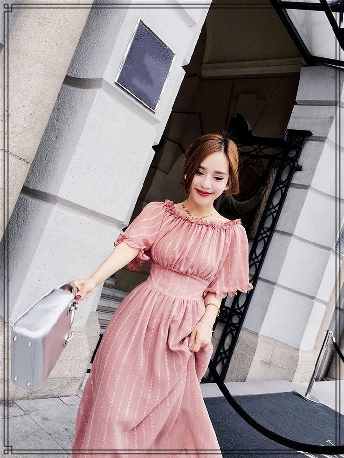 ワンピース オフショルダー フリルスリーブ シフォン ドレス ピンク