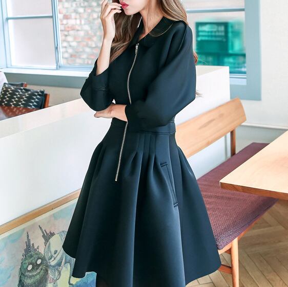 美Aライン フロントジッパー 長袖 フレアシャツワンピース 秋冬